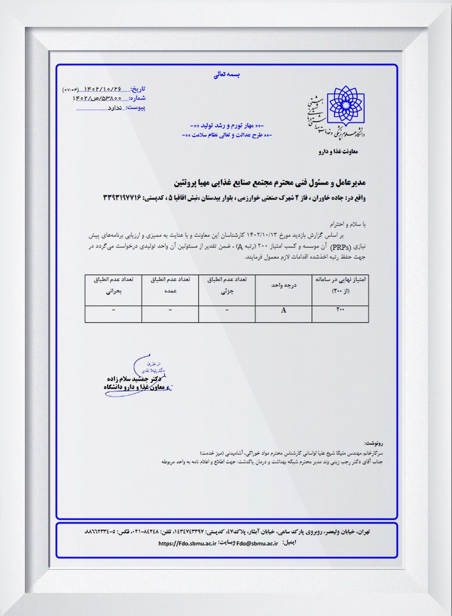 مجموعه صنایع غذایی مهیا بر اساس گزارش بازدید تاریخ 13/10/1402 موفق به دریافت ممیزی برنامه های پیش نیازیPRPS امتیاز کامل 200 از 200 و رتبه A از سمت معاونت غذا و دارو شده است.